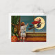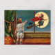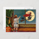 Um belo cartão vintage de Halloween, com uma criança a ver uma bruxa voadora através da janela.
