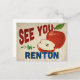 Um charmoso cartão-postal de viagem vintage de Renton, Washington, apresentando uma adorável maçã vermelha, juntamente com um divertido texto em estilo retrô que diz "Vejo você em Renton"