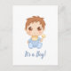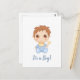 Bebê de desenho animado fofo vestido com um macacão azul com um babador amarelo segurando um chocalho de bebê.