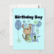 Um macaco-menino rodeado por estrelas, balões, presentes de aniversário e texto que diz "Birthday Boy 1" em t-shirts de primeiro aniversario macaco, fato físico, sacos de tote, autocolantes, cartões e muito mais.