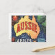 Aussie Apples da Tasmânia é uma etiqueta de caixa de fruta de 1933. Um mapa da Austrália no centro com maçãs vermelhas e verdes ao seu redor.