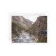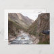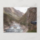 Cartão-postal do trem azul do Caminho Inca que vai de Cusco a Machu Picchu através do Vale Sagrado ou Vale Urubamba com grandes montanhas e Rio Urubamba no Peru.