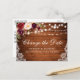 Mudança Floral da Moderna Elegante Watercolor Burgundy Marsala O Cartaz de Adiamento de Casamento de Data apresenta rosas arrojados, rosas cor-de-rosa e verde sobre madeira rústica com luzes de cordas e rendas.