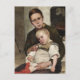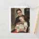 Uma mãe do século 19 com um vestido severo de homespun segura seu filho com lareira e cozinhar no fundo. Vintage fine art, do pintor sueco Gerda Tiren.
