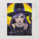 Uma jovem bruxa vestindo seu chapéu pontiagudo e segurando seu gato preto. Lindas cores amarelas e roxas contrastantes fazem com que esta trabalho de arte salte para você.