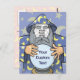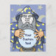 O velho feiticeiro com capa azul e bola mágica de cristal. Use a foto facial para personalizar. Texto personalizado.