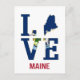 Maine State Love. Principal em letra vermelho brilhante maiúscula. A palavra amor está preenchida com a bandeira estadual e a letra O apaixonada é moldada na silhueta do estado de Maine.