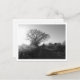 Uma fotografia a preto e branco de uma pista de campo, forrada de carvalho e um celeiro velho, numa manhã gelada.