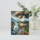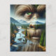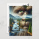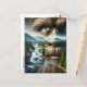 Uma ilustração fantástica do Sasquatch com Pé Grande, montanhas, alce, um cartão postal de rio e rio para manter contato com amigos e familiares enquanto você está fora se agachando!