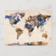Um mapa aquarela do mundo em tons de azul e amarelo dourado