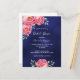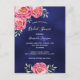 Um chá de panela moderno e moderno. Um fundo azul escuro e marinho azul. A cor azul é irregular. Decorados com flores, florais e verde de cinzas, cor-de-rosa, ligeiramente amareladas. Modelos para a noiva ser o nome e a informação da festa. O nome e é escrito com um moderno estilo escrito à mão. Texto branco. Traseira: design de cartão postal simples. Este cartão também está disponível em nossa loja com um fundo azul no verso.