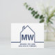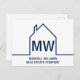 Este cartão postal de marketing monograma azul realtor marinho é personalizado com o nome da sua empresa real sob as iniciais do agente de realty em uma simples tipografia. Esta design minimalista apresenta um contorno simples de uma casa. Cartões postais modernos para um agente que trabalha para comprar e vende casas.