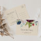 Este marinho burgando moderno, blush floral, salve o cartão-postal da data é perfeito para um casamento de destino. A design apresenta flores vermelhas, burladas, marinhos, roxas, azuis e esbranquiçadas lindamente pintadas à mão e folhas verdes.