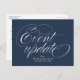 Precisa cancelar ou adiar seu evento devido a circunstâncias infelizes? Catástrofes como pandemias, tempo severo, doenças, morte podem causar um golpe esmagador em um grande dia. Envie um aviso aos amigos, familiares e associados com este cartão postal simples e agradável. O verso inclui um grande bloco de texto personalizado com a redação sugerida. Há também espaço para você assiná-lo. O esquema de cor azul do marinho pode ser editado clicando em "personalizar mais". Também trabalha para outros eventos que precisam ser adiados como festas de formatura, bailes de formatura, arrecadadores de fundos, galas, reuniões familiares e muito mais.