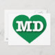 Este cartão-postal apresenta um coração verde vibrante contendo as letras maiúsculas, brancas e em negrito MD, a abreviação oficial de Maryland, o antigo estado de linha. O verso da placa de posto é vazio, aguardando seu texto personalizado ou sentimentos manuscritos.
