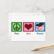 Um sinal de paz, coração, e alguém deitado numa mesa de massagem.