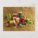 Este cartão postal colorido exibe as ferramentas da costureira. Colheres brilhantes de fios em cores arco-íris de suporte verde, vermelho, rosa, turquesa, amarelo, dourado, azul e laranja ao lado de uma fita de medida, thimble, botões e pinos. Todos são colocados sobre uma imagem de um fundo de padrão de burlap castanho.