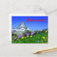A Matterhorn excelente nos Alpes suíços! Esta fotografia cênica da natureza foi tirada no topo de um morro verde pastoso com flores silvestres roxas, azuis e amarelas coloridas na Suiça.