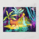 Uma menina de cabelos escuros em um lindo Sari com um cântaro de água na cabeça caminha pela floresta tropical ao lado de um leopardo domesticado cercado por palmeiras, arbustos, flores coloridas e árvores tropicais. A atmosfera mágica e cintilante da ilustração nos leva aos contos de fadas antigos e familiares.