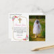 Dê obrigados à sua família e amigos por estarem presentes na sagrada comunhão do seu filho com este bonito cartões de agradecimentos de fotos da comunhão floral e de ouro crus. Este design apresenta um simples fundo branco na parte frontal da placa. Uma cruz de ouro com um buquê floral cor-de-rosa fica no lado esquerdo do cartão com um lugar para colocar uma mensagem e uma assinatura de obrigado. Personalize o lado direito do cartão com uma foto do seu filho. Há um lugar para colocar o seu endereço de volta nas costas para a sua conveniência.