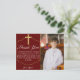 Dê aos seus amigos e família uma nota de obrigados com este obrigado de comunhão Burgundy 1rua que você fotografou. Este cartões de agradecimentos de comunhão apresenta um fundo rico e cheio de burlômetros com uma bela cruz de ouro. Adicione uma nota de obrigados, a assinatura do seu filho, assim como uma foto do seu filho para comemorar a sua Primeira Comunhão, muito especial. Um nome pré-impresso e um endereço de devolução são adicionados convenientemente no verso. Perfeito para a comunhão de 1rua de um menino.