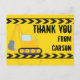 Cartão postal de agradecimento de veículo de construção personalizado e legal para uma criança que ama veículos de construção amarelos em preto e amarelo. Design de escavadeira divertida para um menino que ama carros e caminhões. Personalize com o nome do seu filho sob a fita de advertência preta e amarela.