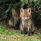 Dois kits de raposa vermelha gostam da sombra de um verde-vivo num Primavera quente dia.