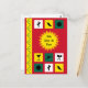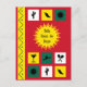 O design deste cartão é inspirado nas alegrias do México. As cores são verde, vermelho e branco para a bandeira mexicana, com a adição de um amarelo sol brilhante. "Feliz Cinco de Mayo" = "Feliz Cinco de Maio". O fundo é vermelho, com um sol no meio e uma faixa com padrão zigue-zague na lateral esquerda. O padrão de nove quadrados coloridos contém ícones temáticos mexicanos em silhueta: cacto, pimenta, sol, taça de coquetel, sombrero e maracas.