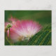 Este cartão-postal floral apresenta uma flor de Mimosa rosa sedosa e branca com folhas em um fundo natural.