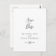 Este simples minimalista guardar o cartão postal é perfeito para um casamento moderno. O design simples e elegante apresenta a tipografia de scripts clássicos e ricos em preto e branco.