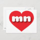 Este cartão-postal apresenta um coração vermelho vibrante contendo as letras maiúsculas mn em letras maiúsculas, brancas e arredondadas, uma abreviação lúdica para Minnesota, o estado estelar norte. O reverso da placa é vazio, aguardando seu texto personalizado ou sentimentos escritos à mão.
