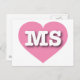 Este cartão-postal apresenta um coração cor-de-rosa vibrante contendo as letras maiúsculas, brancas e em negrito MS, a abreviação oficial para Mississippi, o estado magnólia. O reverso do cartão postal é vazio, aguardando seus sentimentos manuscritos ou texto personalizado.