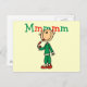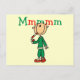 Um design de camiseta de Natal com uma figura de palitos, uma criança comendo uma cana doce e um texto vermelho e verde que diz "Mmmm".