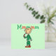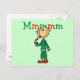 Um design de camiseta de Natal com uma figura de palitos, uma criança comendo uma cana doce e um texto vermelho e verde que diz "Mmmm".