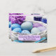 Cartão postal para o café da manhã de páscoa ou café da manhã de brunch, com imagem de ovos pintados em cor azul e roxa festiva. Excelente para usar para sua receita favorita ou para compartilhar com alguém que você ama!
