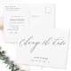 Cartão postal de adiamento/mudança de data de casamento personalizado com design moderno e elegante de caligrafia manual em preto e branco.