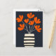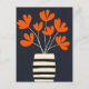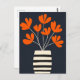 Uma coroa floral tangerina em um vaso riscado marinho chama atenção contra um pano azul-céu calmo.