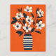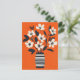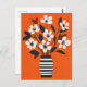 Uma coroa floral tangerina em um vaso riscado marinho chama atenção contra um pano azul-céu calmo.