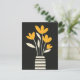 As pétalas de cor mostarda florescem a partir de um vaso sólido listrado a preto, ligeiramente deslocado por um fundo aqua.