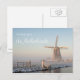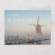 Cartão postal de um moinho de vento tradicional holandês coberto de neve numa paisagem rural em Aarlanderveen, Países Baixos, no inverno, à luz quente da manhã, no nascer do sol, com o texto: "Saudações dos Países Baixos".