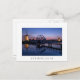 Cartão postal de duas moinhos de vento iluminadas e uma ponte de tração com reflexo na água do canal, à última luz do pôr do sol, em Kinderdijk, nos Países Baixos, com uma fronteira branca, e o texto: "Países Baixos".