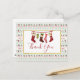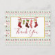 Convite para festa de Natal com um padrão repetitivo ao fundo, no estilo de suéter feio de Natal. O padrão é composto por meias, bolas de Natal, estrelas e flocos de neve. Com o texto Feliz Natal repetido em vermelho. Divertido e festivo. Sobreposto há um retângulo branco com uma borda dourada falsa, dentro dela uma ilustração de meias de Natal antigas e a palavra Obrigado escrita dentro. Mensagem no verso que você pode personalizar.