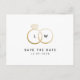 Um monograma moderno fica encantado com anéis de casamento falsos dourados entrelaçados e simples fazer de texto personalizado que salva o cartão-postal de um novo clássico com texto em branco e preto limpo. Personalize todo o texto desse mínimo, salve a data e adicione uma foto de noivado para uma aparência simples e reduzida, enquanto dirige seus convidados para salvar a data do seu grande dia.