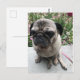Mops im Garten vor der Blumenwiese. Schöne Postkarte für Hundeliebhaber.
