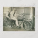 Este postal mostra uma fotografia antiga dos anos 30 de dois homens, um menino, e um ursinho de pelúcia posando em uma moto.