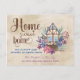 Envie anúncios que você mudou ou comprou uma casa com este cartão postal bonito. Casa de estilo Tudor pintada com embelezamentos de flores, Home Sweet Home word art em um fundo pintado com aquarelas. O reverso tem galho floral e casa.
