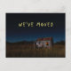 A mudança de endereço do cartão postal mostra uma casa pequena e velha numa noite escura, com uma figura assustadora numa janela laranja. O texto amarelo diz "Nós nos movemos" acima da casa assombrada.