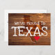 Crie seu próprio cartão postal "Nós Mudamos para o Texas". Altere as cores da fonte. Você pode mover o coração ou apagá-lo. O fundo é um grão de madeira de estilo "vintage" escuro com uma forma de mapa digital de corte de isel do estado do Texas. Uma imagem de granja de madeira, estilo vintage.