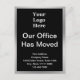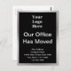 Frente: uma imagem de exibição está no topo. Você pode substituir a imagem pelo seu logotipo. "Nosso escritório se mudou" está no centro. Quatro linhas de texto branco para o seu novo endereço estão na parte inferior. A frente tem uma borda prateada faux (não de folha metálica). Traseiro: a parte traseira tem 6 linhas de texto preto. Você pode editar ou excluir qualquer texto para criar uma mensagem personalizada para seu público.