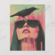 Uma mulher e um pássaro preto com uma torre de cristal rosa ao fundo